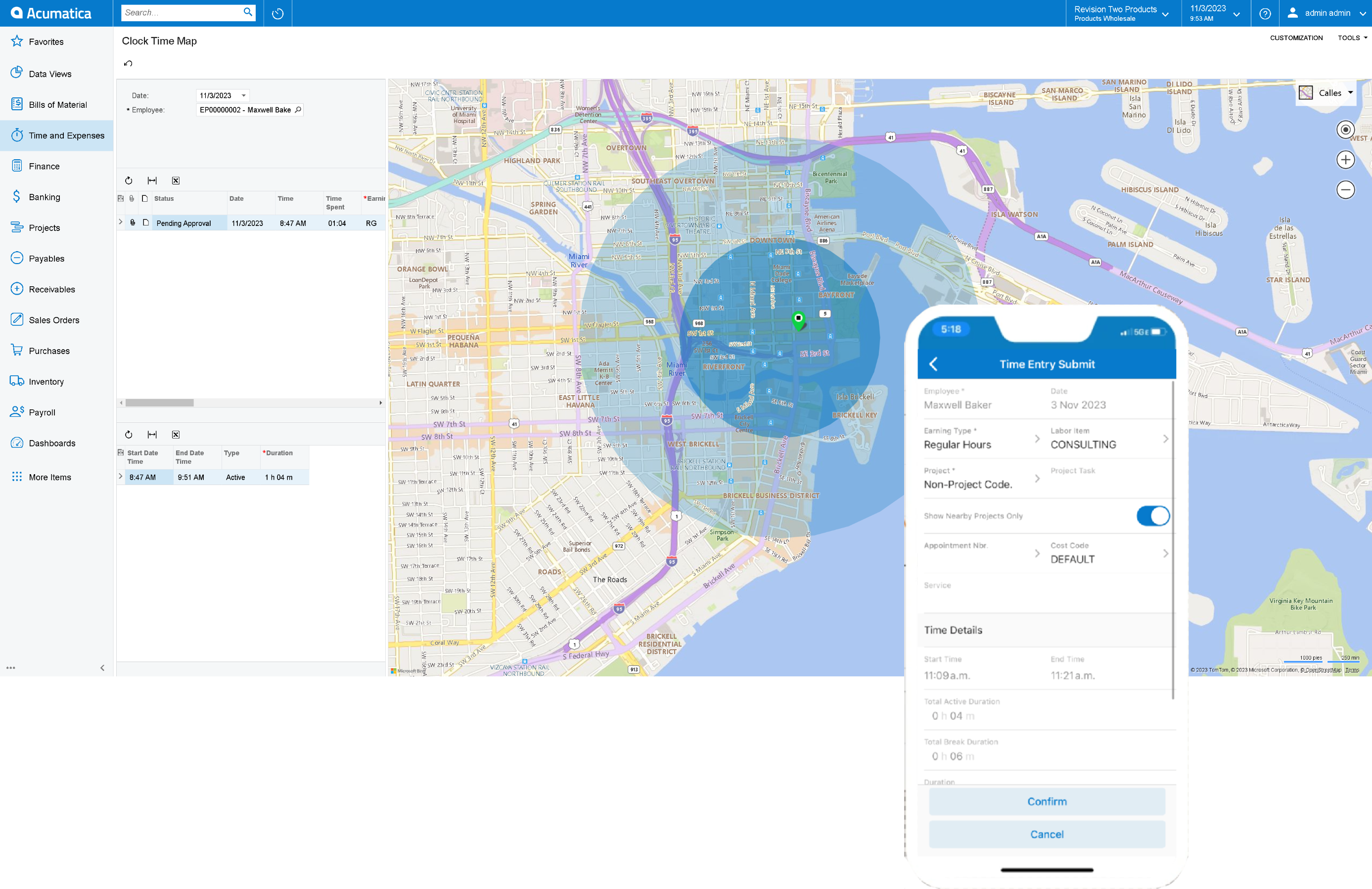A seamlessly integrated solution that improves time tracking for field employees. It offers clock in/out features within the Acumatica mobile app, and monitoring and control improvements, through the Acumatica web interface. These two components collaborate to deliver an improved time tracking experience, harnessing the capabilities of Acumatica's Time and Expenses modules.