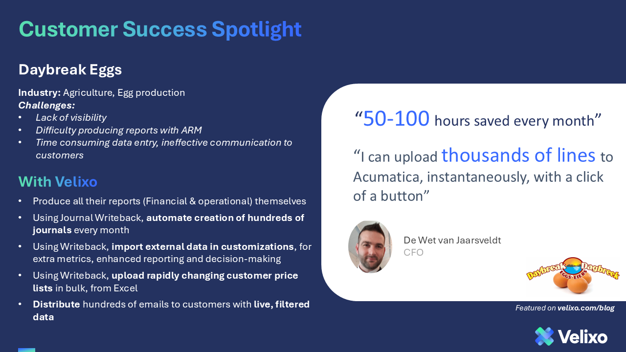 Velixo is my FAVORITE addition to Acumatica. The previous frustrations of "I know how to do that in Excel why can’t I do it in Acumatica" are gone. I love it. 5 stars!