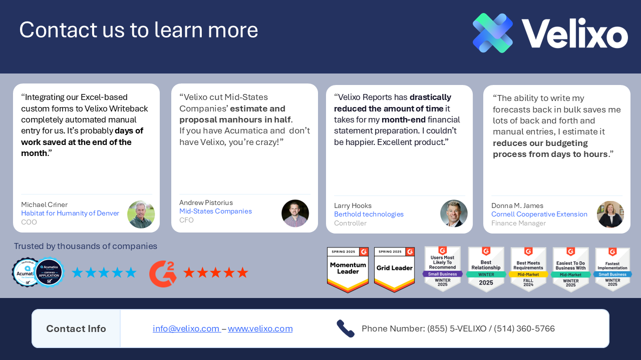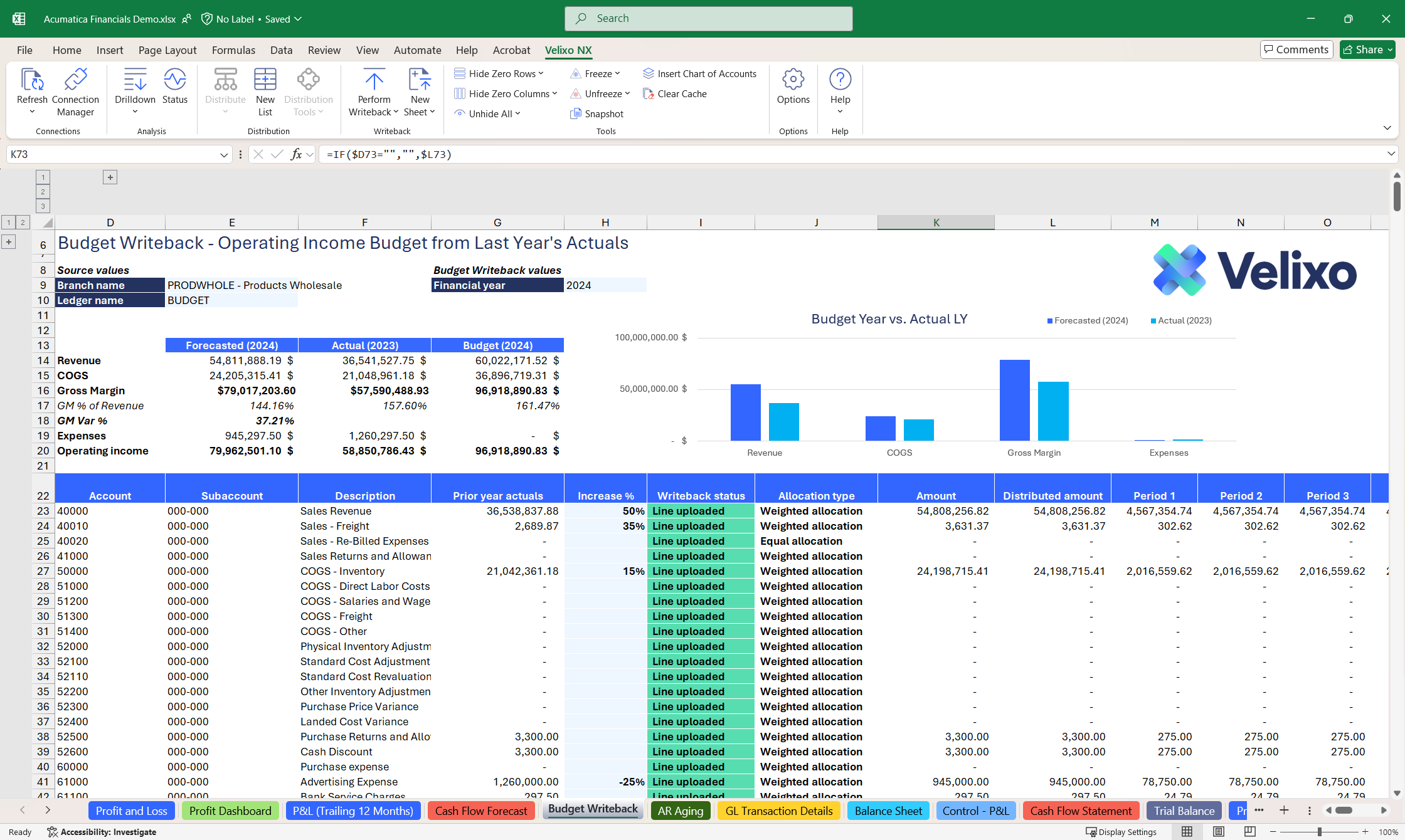 Velixo is a modern reporting, budgeting and data automation software that seamlessly integrates with Acumatica from Excel, in real-time.